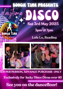 Boogie Time - Daytime Disco with a difference! Sat 3rd May, Lola Lo Reading 🕺Exclusively for those lucky over 40's! 🤩 Boogie to the best...